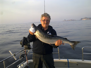 En flot laks på 7,82 kg med en flot Ø gruppe i baggrunden.