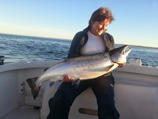 Marianne og jeg var taget ud for at nyde det gode fiskevejr. Vi havde bryllupsdag i går, så i stedet for blomster var jeg så letsindig at love Marianne en 10+ laks. Det ville hun også hellere have, så vi fiskede hele dagen vest for øen i kanalen og ned mod ubåden. Ingen fisk til os – og i det hele taget var der meget lidt aktivitet på radioen, kun få meldinger men til gengæld om store fisk.