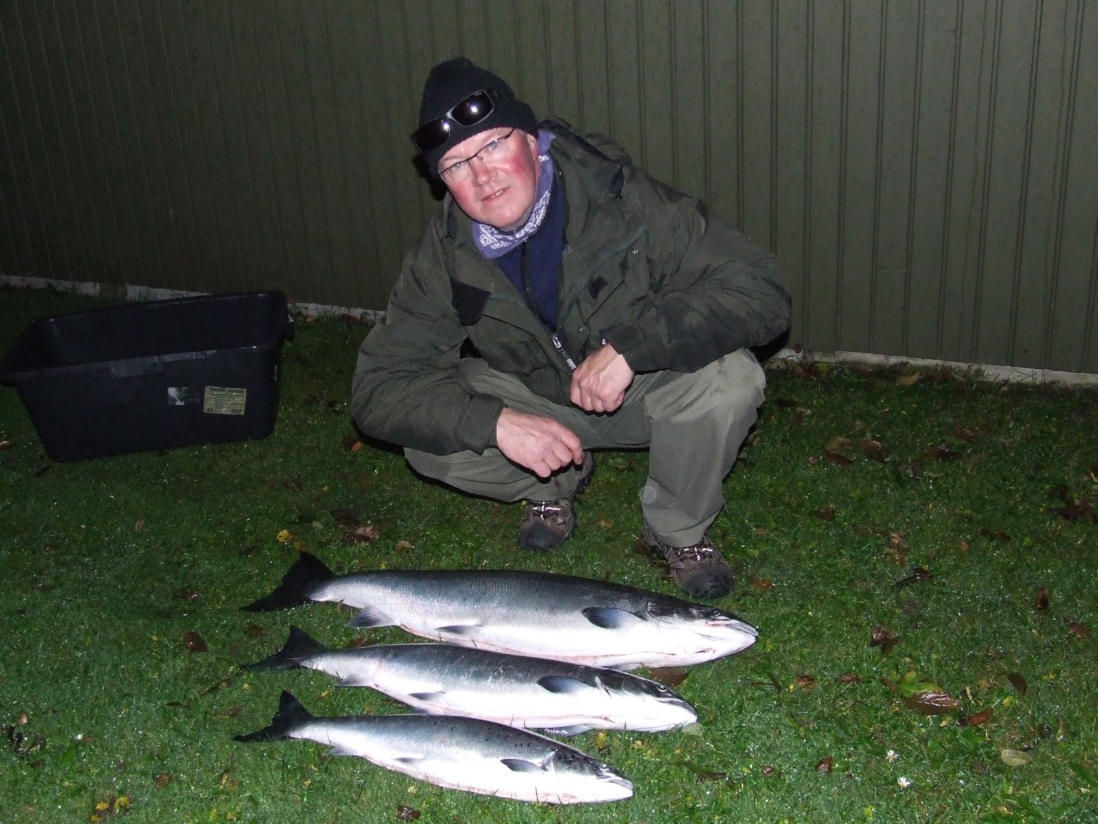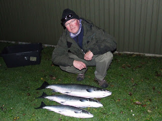 Fredag d. 9. november. Jeg havde enlig fået båden på vandet efter en del reperationer m.m. nu skulle der fiskes. Jeg startede syd for Stablen, fint vejr så jeg slappede af, lidt for meget for jeg fik fat i et garn så lodderne sad fast – øv, efter noget påstyr fik jeg dem fri men wejeren blev flosset på den ene Dawnriker så måtte jeg bare forsætte med tre stænger, halv kraft. Væk der fra og ned på Fortorvet hvor der ikke var garn, her var lodningen fin så jeg kørte frem og tilbage nogle gange, lidt nap ellers ikke noget. Hen på eftermidagen skete der endlig noget, to laks på 2,25-4,7 kg. i 110 fods dybde de to fisk tog et mørgt blink.
