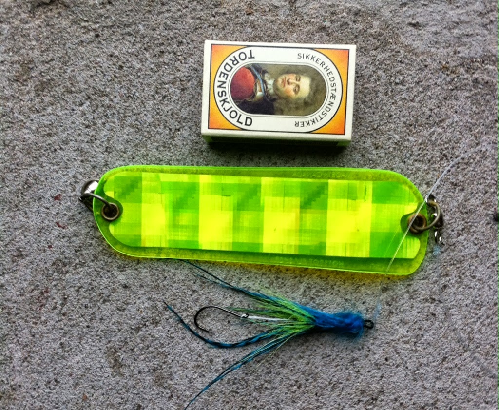 | I går fik jeg et par laks, bl.a. en på godt 8 kilo, og jeg ‘mistede’ også én i et dobbelthug i 100 og 80 fod. To af laksene huggede på det viste endegrej: en mini-mini flasher og en canadisk trollingflue af den såkaldte intruder-type (efterhængt krog i kevlarløkke). M.v.h. Poul Stadler |