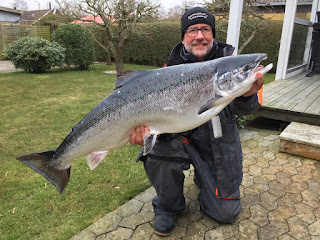 Det utrolige skete. Efter en fantastisk tur i går med laks på 16.1 kg var jeg så heldig at en kæmpelaks igen i dag tog en af mine agn. En af de stive woblere, bag en flasher nede i 90 fods dybde. Jeg kunne straks mærke at det var en tung fisk og den gav kamp til stregen. Den gik i dybet utallige gang efter den var henne og kigge på båden, men efter en halv time kom muligheden for at trække den ind over nettet. Den var 112 cm lang og meget tyk så jeg gættede på at den kunne slå min laks fra i går. Vel inde på land viste klubvægten 17,54 kg, min hidtil største laks, skønt. Knæk og Bræk Anders