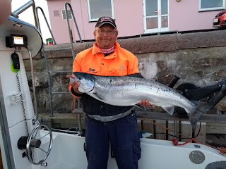 Tog en tur syd på hvor der var masser af lodning men intet skete længe så til sidst på aftenen firede jeg dawnriggen ned til 110 fod jeg havde 42 m vand og satte mig ind forengangskyl men det var ik længe jeg kunne det for der var hug med det samme næsten 97 cm og lige nøjagtig 10 kg mvh Jan Kohlmetz