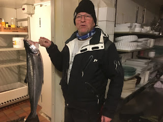 Kl. 10 huggede en fin spise laks på en grønlig Rhino blink. Den tog på snigeren. 4,3 kg og 82 cm.
