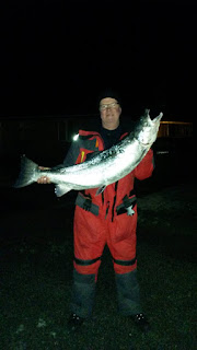 Jeg var en tur syd på i mellem Bob og 29 favne, der sejlede jeg frem og tilbage hele dagen og nød det fine vejr med sol og ingen bølger, der var meget lodning men ingen laks bed på krogen pyt med det vejret var jo fint 😊men så lige som solen ramte vandet i horisonten lød hvinet fra den nederste stang på 120 fod hvor på der sad en af de store stive malet i klovne farverne, det viste sig at være en god laks på 12,42 kg og 109 cm lang 😁inden jeg fik orden på alt om bord og rettet min ryg var det blevet mørkt, da båden ikke sejler så stærkt blev det sent inden jeg var i havn,men Laif kom alligevel og kontrol vejede den trods håndbold kampen 😆