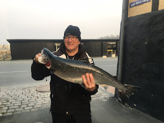 En tur nede ved bakkerne hvor det blev til 3 fisk. 2 undermålere i et dobbelthug, som blev pænt genudsat. Et par timer senere huggede en fin laks (billede) på 5,3 kg og 82 cm i 120 fod.