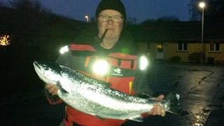 Så lykkedes det mig at komme på havet, jeg havde hørt at der var laks syd på men jeg tog ret øster ud mod Gårdemærket, og det viste sig at der var flere som var kommet på denne ide, så vi jagtede noget rundt der ude, ved kl. 10 tiden ville jeg lige kontrollere om der var møg eller fisk på krogene, der var der ikke så jeg satte grejet igen, da der manglede 2 stænger kom hugget det viste sig at være en laks på 80 cm og vejede 6,2 kg flot fisk. den tog en blinket som var en klovne farvet af den Store stive monteret efter en sølv farvet Flacher, på 120 fod vand.
