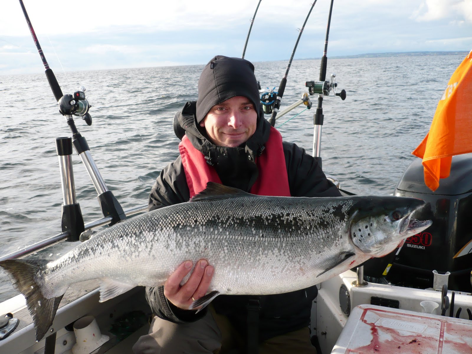 Jeg får lige sagt til Per, nu heller jeg the op i koppen så får vi hug, jeg nåede kun lige en tår før vi røg ud af stolene! Vi fik en laks på 7.99, efterfølgende kunne vi drikke the og kaffe færdig, men den var nu blevet lidt kold… Men hvad gør det når der er laks i båden og P4 Bornholm i Radioen;-)